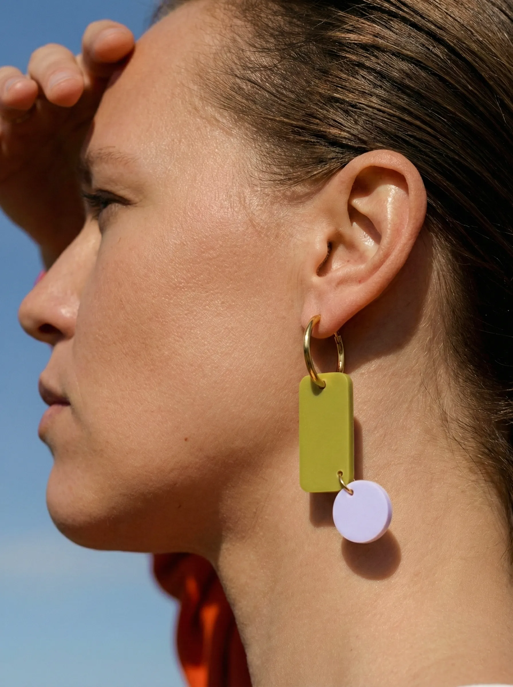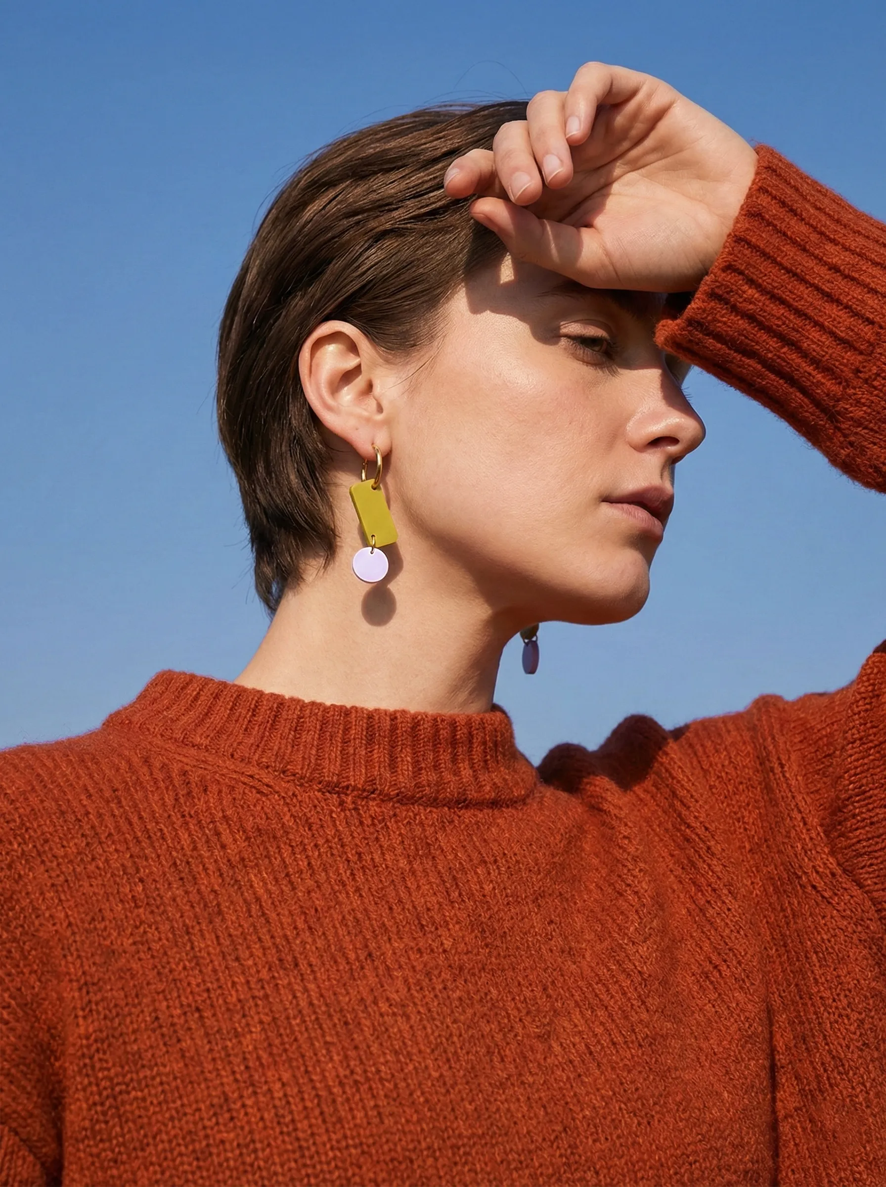 AI-generated product photography for Niemalsmehrohne — a contemporary jewellery brand defined by bold color, geometric form, and everyday wearability. This visual series explores portrait-driven product storytelling, combining skin-close detail with graphic composition. The result balances natural realism with a stylized editorial feel while preserving material accuracy and production-grade lighting.