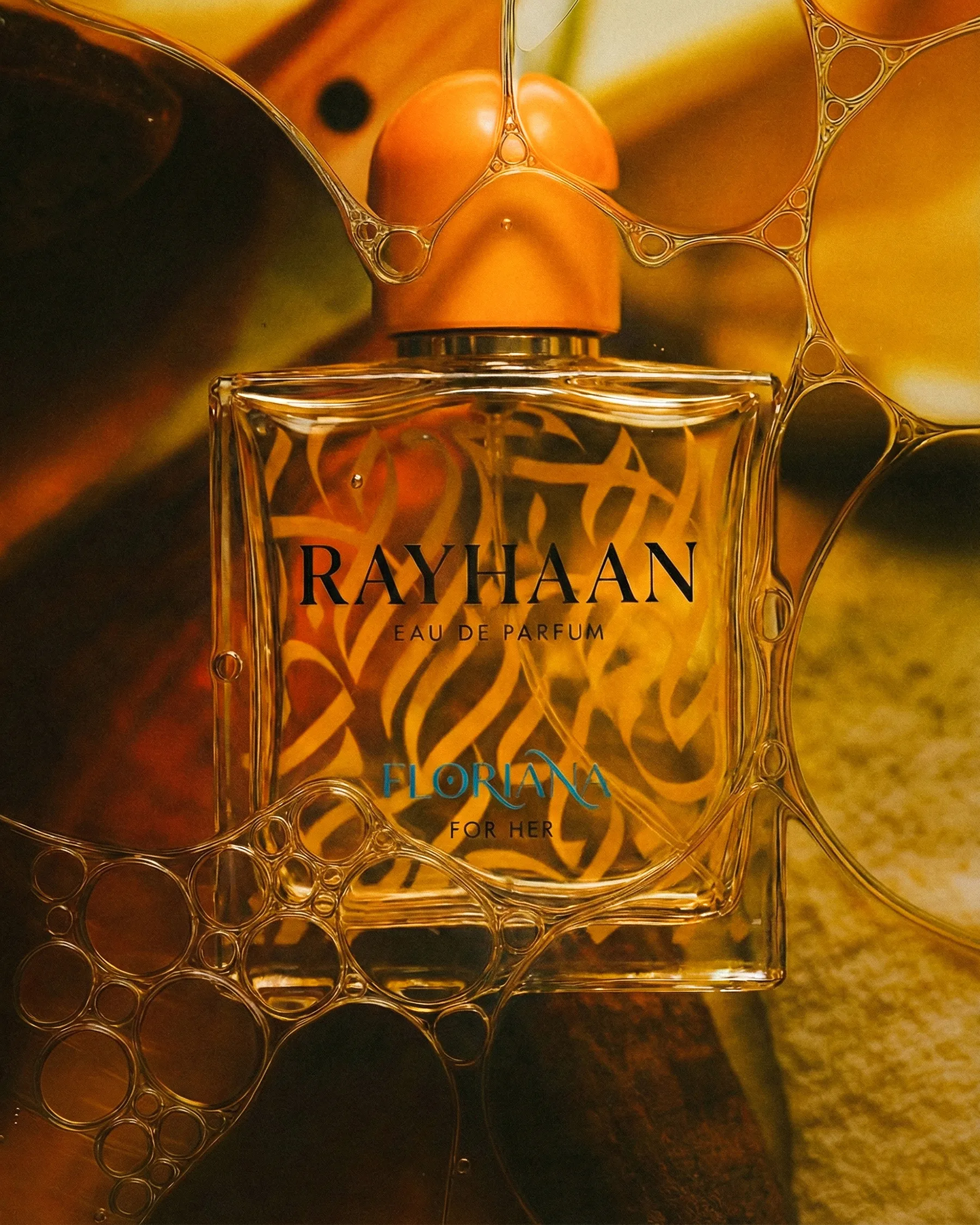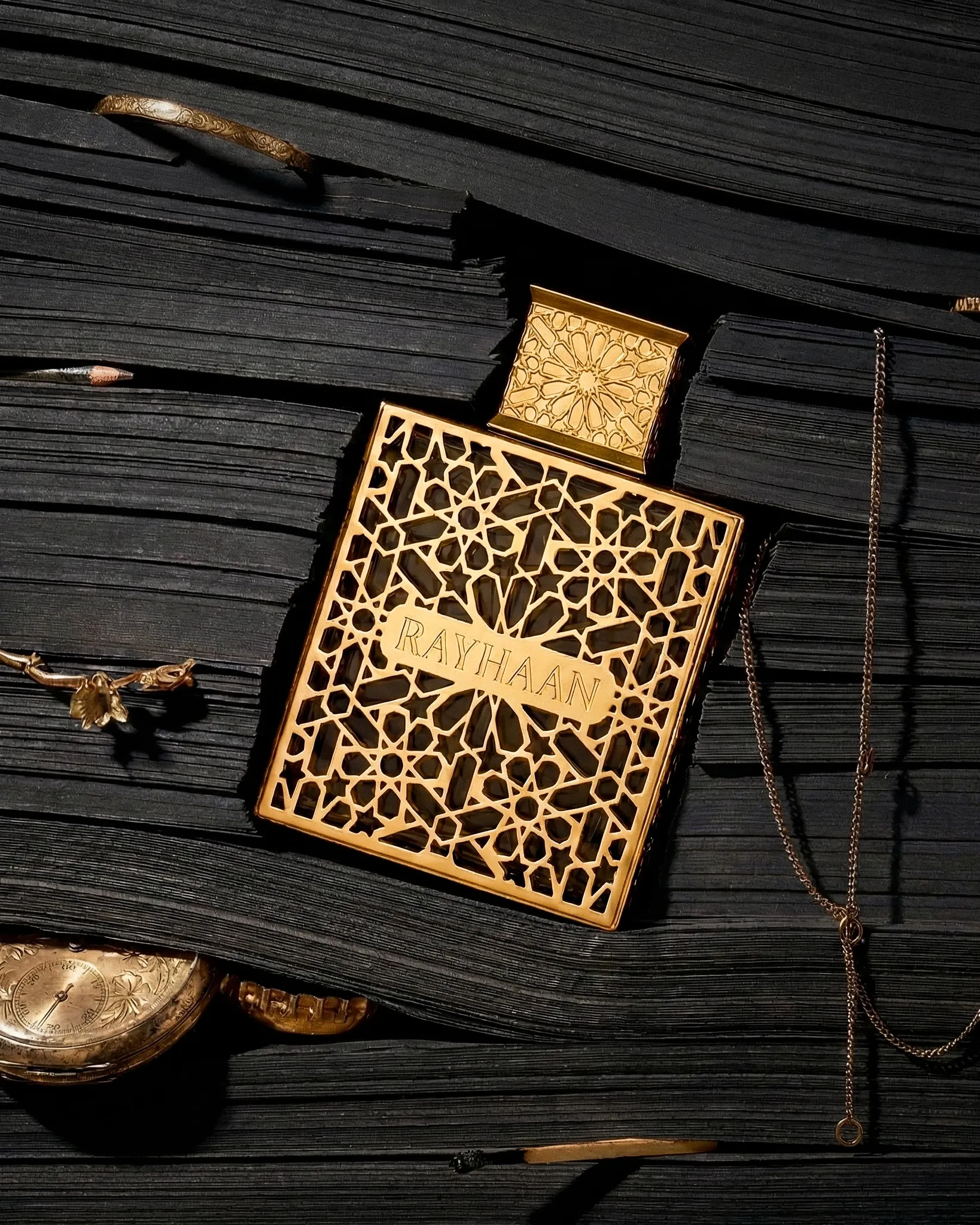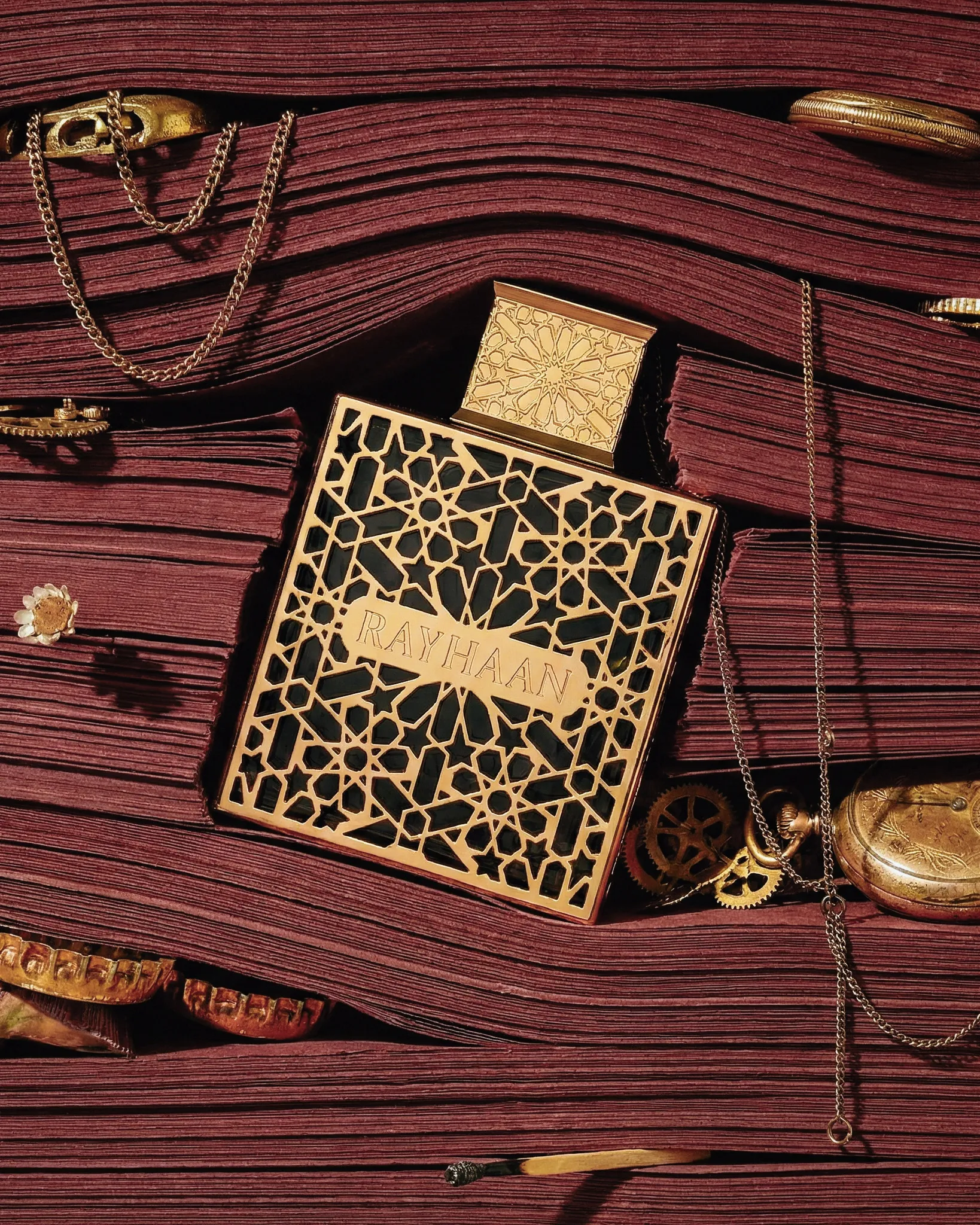 AI-generated product photography for Rayhaan — a fragrance house defined by richness, ornament, and depth. This visual series explores contrast, pairing intricate gold geometry and deep burgundy textures with brighter citrus compositions and sculptural still lifes, presenting the bottle as both object and atmosphere.